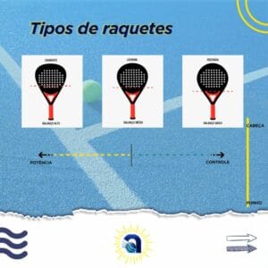 Você sabia que existem três tipos diferentes de raquetes para se jogar padel? A raquete com cabeça em forma de diamante tem a distribuição do peso na extremidade da raquete, sendo ideal para competições, quando o benefício visado é a potência. A de cabeça redonda é ideal para quem quer iniciar no esporte pois tem o ponto ideal de batida no centro e a distribuição do peso sobre o punho. A de cabeça em forma de lágrima está entre os dois modelos acima descritos: a distribuição do peso está sobre o meio da raquete, o que confere equilíbrio entre controle e potência.