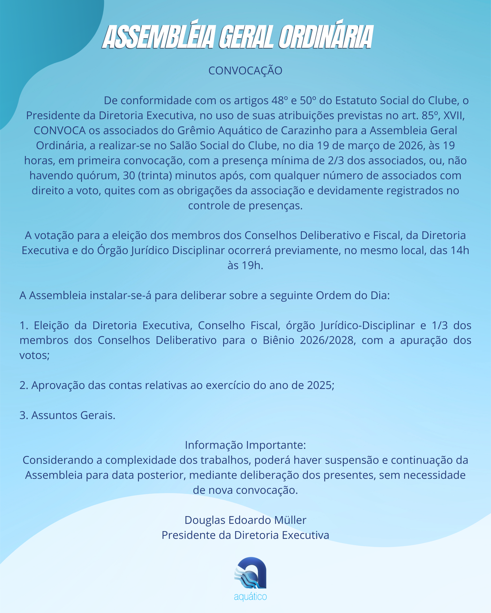 O Grêmio Aquático de Carazinho convoca seus associados para a Assembleia Geral Ordinária, a realizar-se no dia 19 de março de 2026, no Salão Social do Clube.